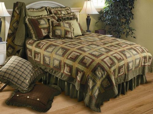 Tea Cabin showcases classic log cabin patches in this authentic tea stain quilt. Tea Cabin is framed in a mossy green border and reverses to a check backing in a mossy green. Due to the tea stain process, each piece is uniquely colored. Coordinating ruffle is tight plaid. Quilts are oversized to accommodate today's deep mattresses..../ Tea Cabin King Quilt / Quilts Country
